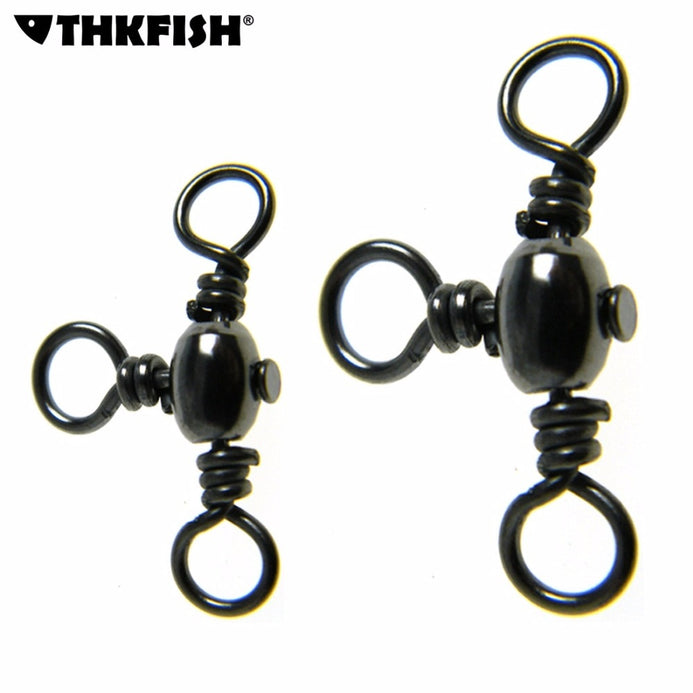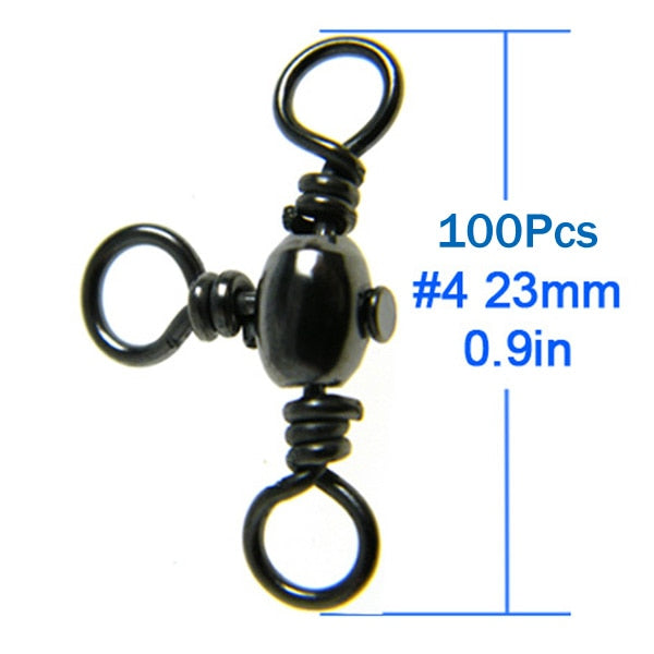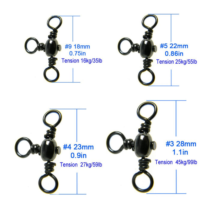 High Strength Three-Way Cross-Line Fast Rolling Barrel Swivels. Corrosion Resistant Black Finish.  Grab a pack and take them with you on your next fishing adventure!