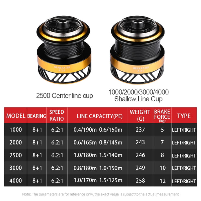 BG1000 | Gear Ratio: 6.2:1 | Weight: 237g | Bearings: 9BB | Max Drag: 6KG | Line Capacity: 3LBS.(0.165MM)-130M(140YDS.)4LBS.(0.205MM)-100M(110YD5)