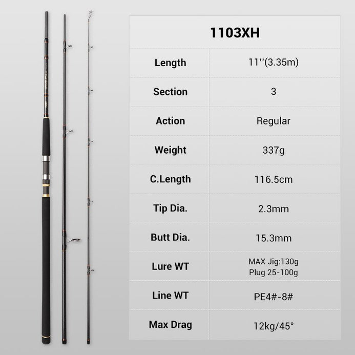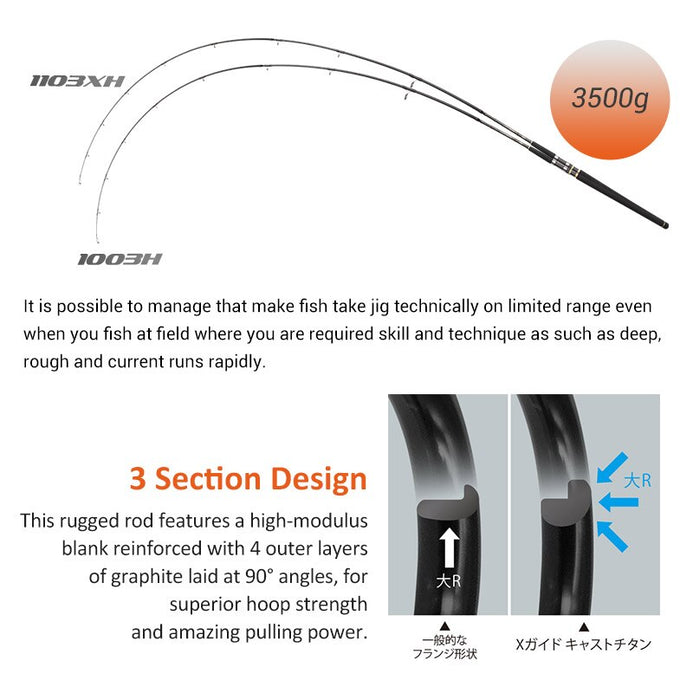 1103XH:You can cast heavy jig around 150g easily and semi-flexible tip section will reduce burden of angler when you have keep jerking heavy jig all day long. While fighting, it shows its high power ranks with an existing model 1103XH. Of course it have enough power left to fight to Blue Runner around 4~5 kg, you can keep big fish even around 10kg under control at your will.