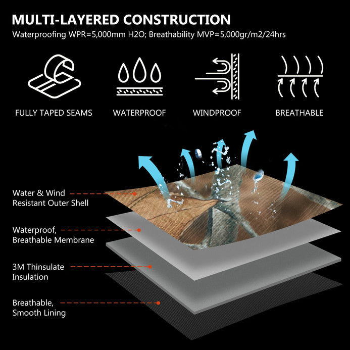 Multi-layered construction - High strength, durable, tightly woven ripstop out layer resists thorns and abrasion, while the inner waterproof, breathable membrane and the heat sealed seams ensure they remain 100% watertight; 3M Thinsulate Insulation (3M and Thinsulate are trademarks of 3M, used under license in Canada); With skin-friendly lining