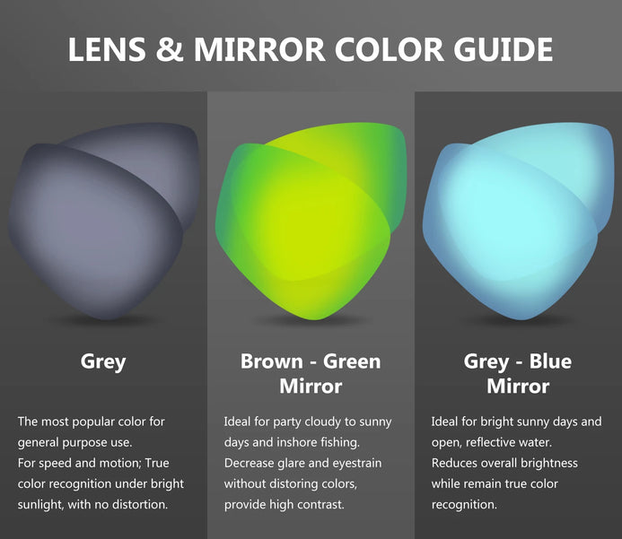 Grey lenses are the most popular color for general purpose use, ideal for bright sunlight, medium light and partial shade with true color recognition; Blue mirror lenses are ideal for open, reflective water; Green mirror lenses good for shallow water, inshore fishing, provide high contrast