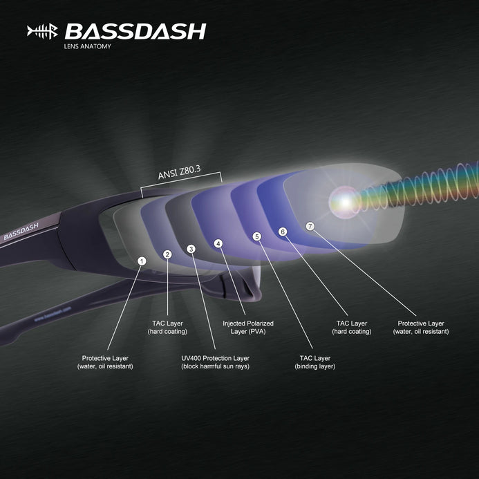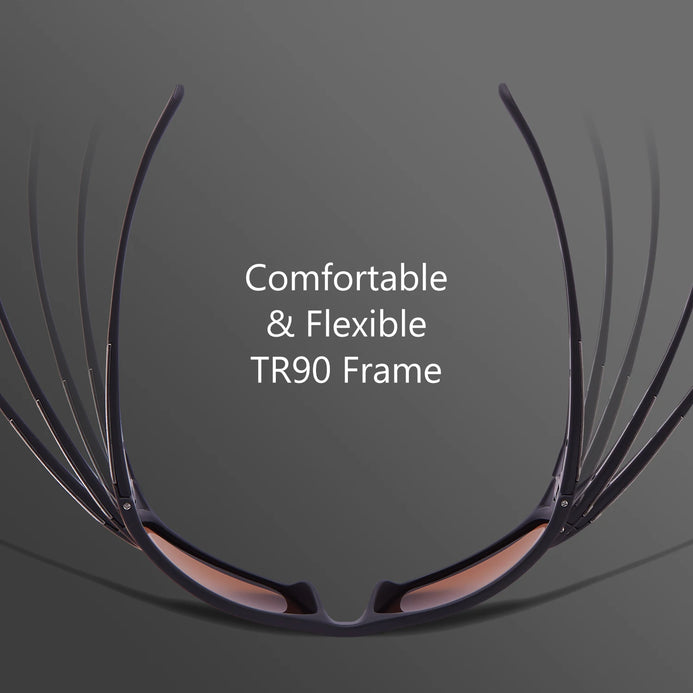 Polarized lenses reduce visible glare from water, snow, sand, pavement and overall optical distortion for increased visual clarity and decreased eye strain; UV protection layer blocks 100% of the harmful UVA, UVB, and blue light up to 400um