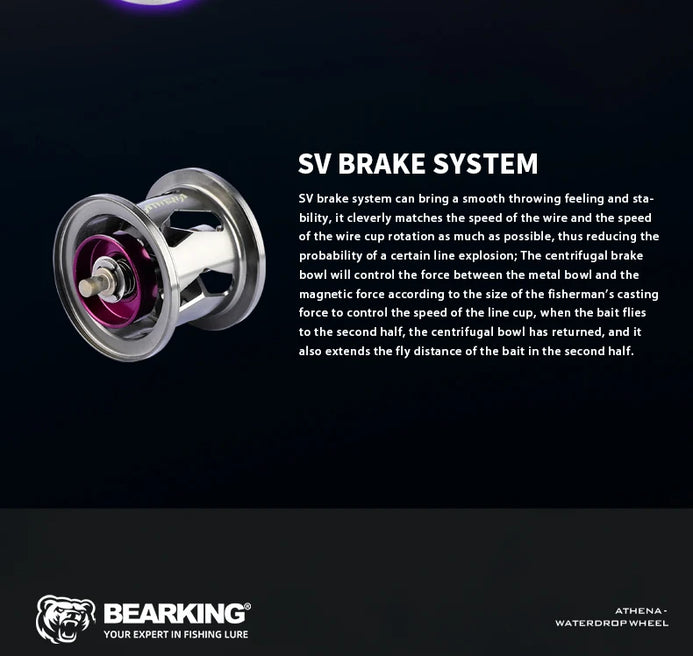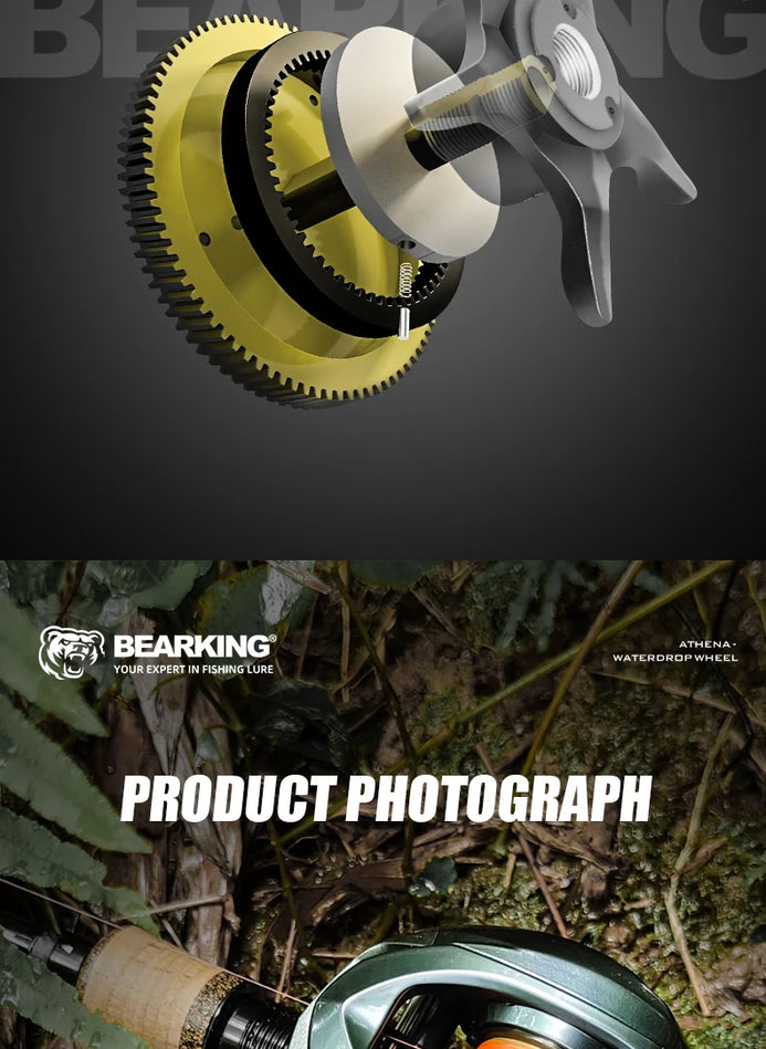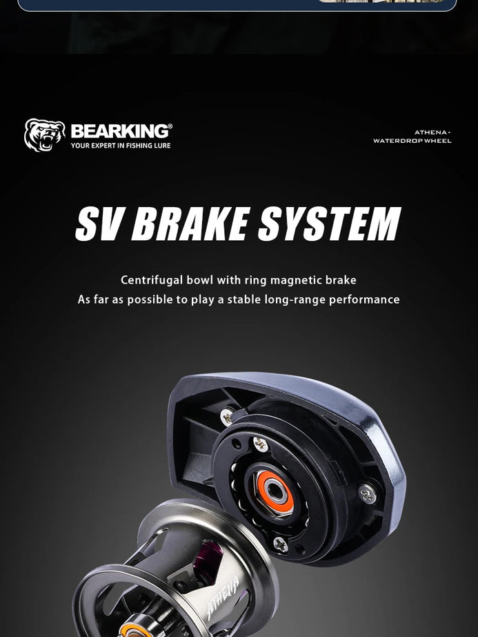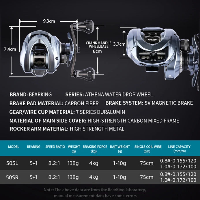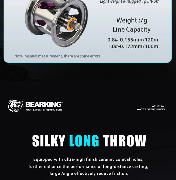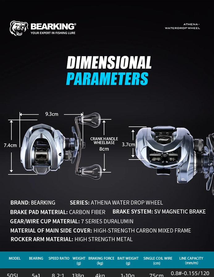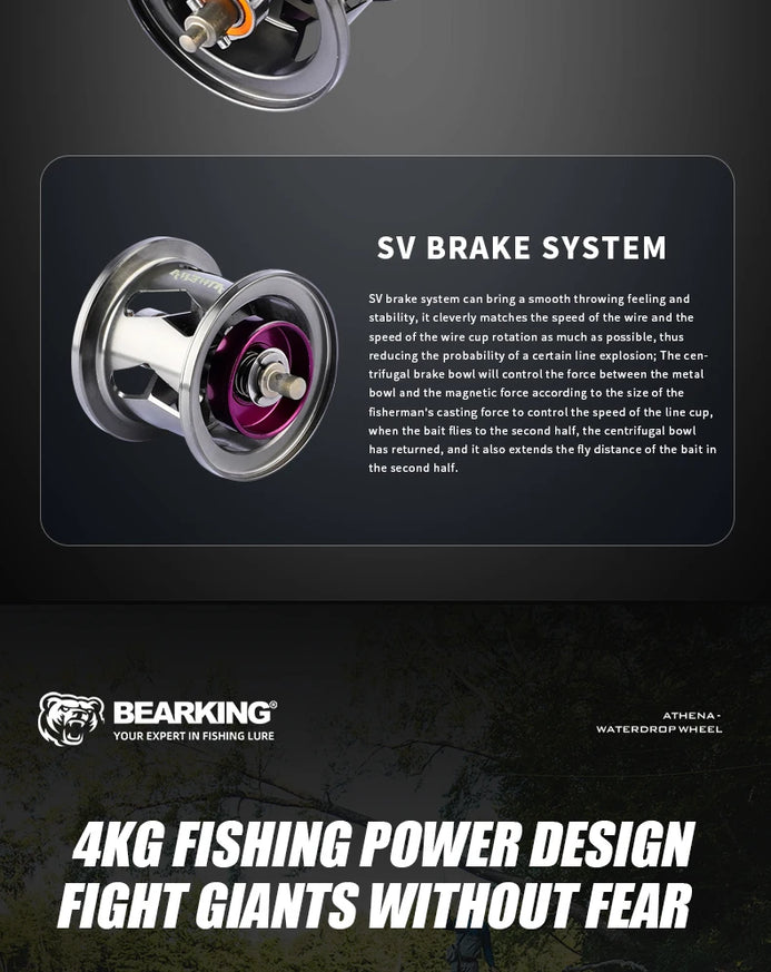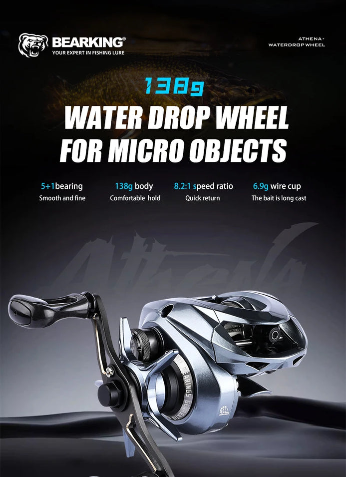Experience the thrill of ultimate precision and control with the BearKing Athena Waterdrop BFS Baitcasting Reel. Weighing in at only 138g, its ultra light carbon construction allows for effortless casting. With a gear ratio of 8.2:1 and 5+1BB, this reel provides unmatched speed and smoothness. Dominate the waters and reel in the big catch with the BearKing Athena!
