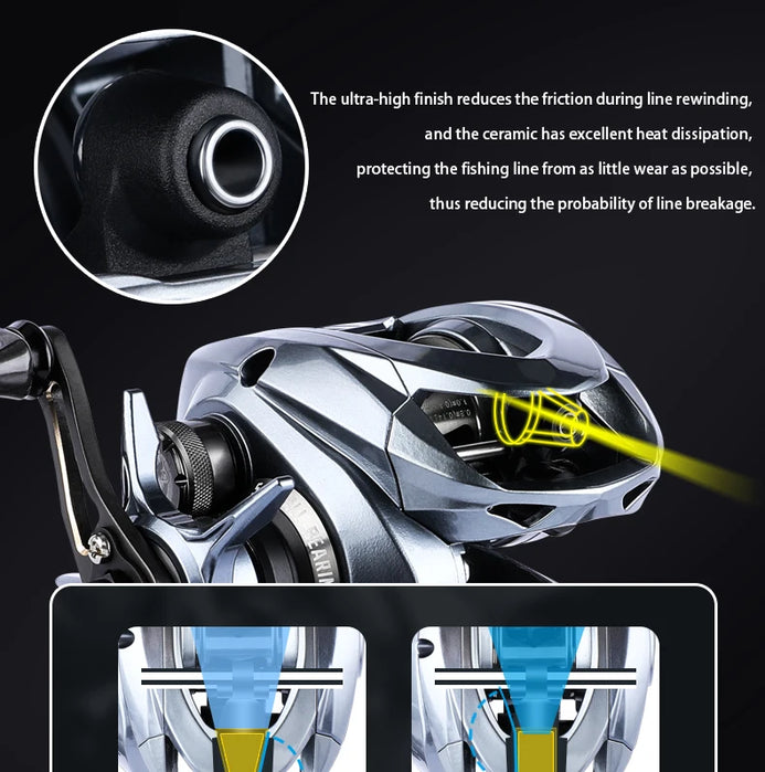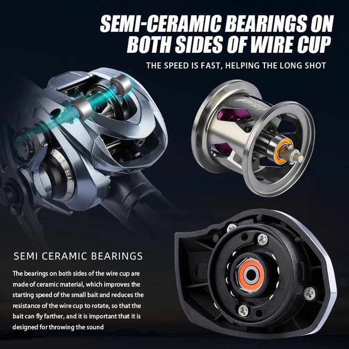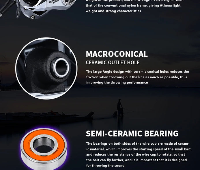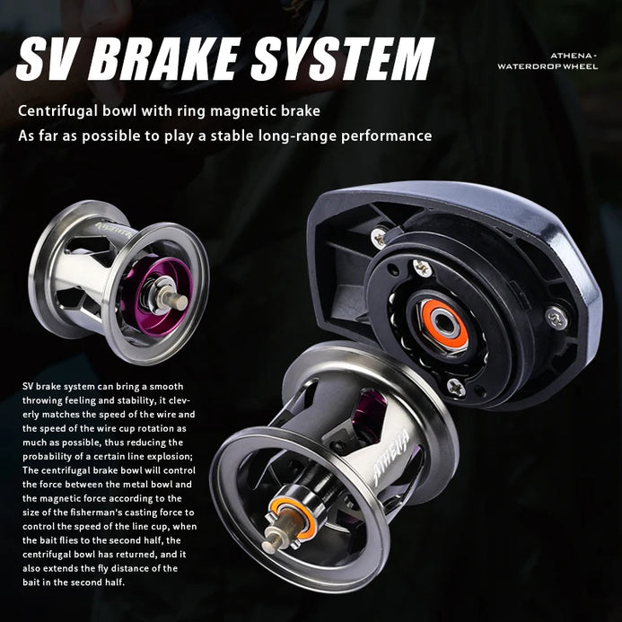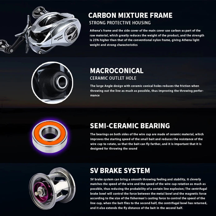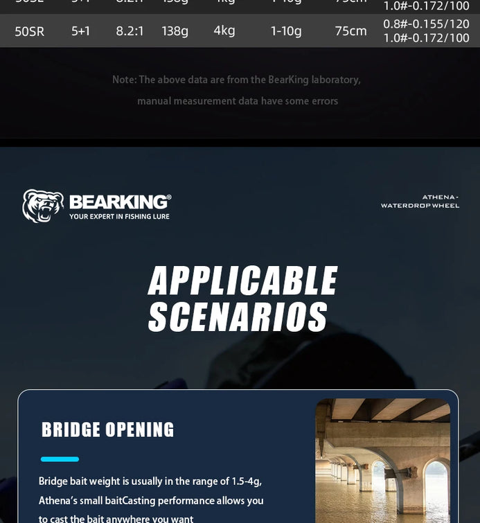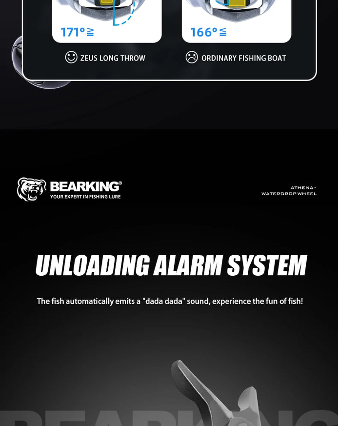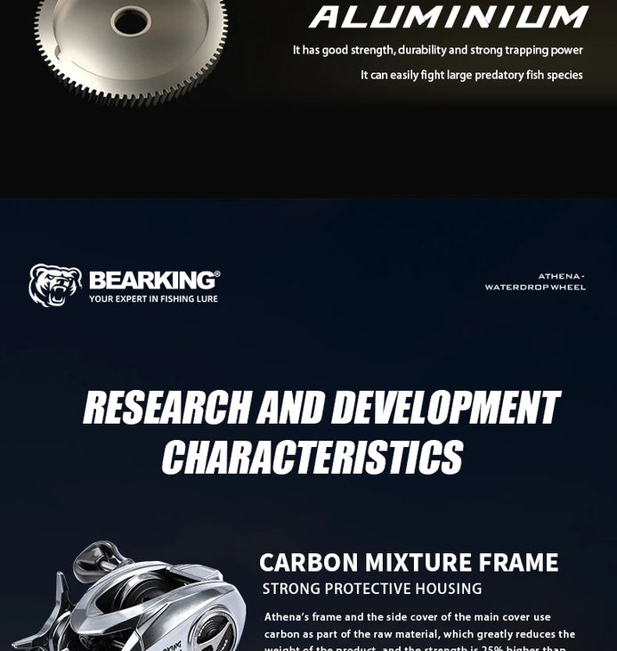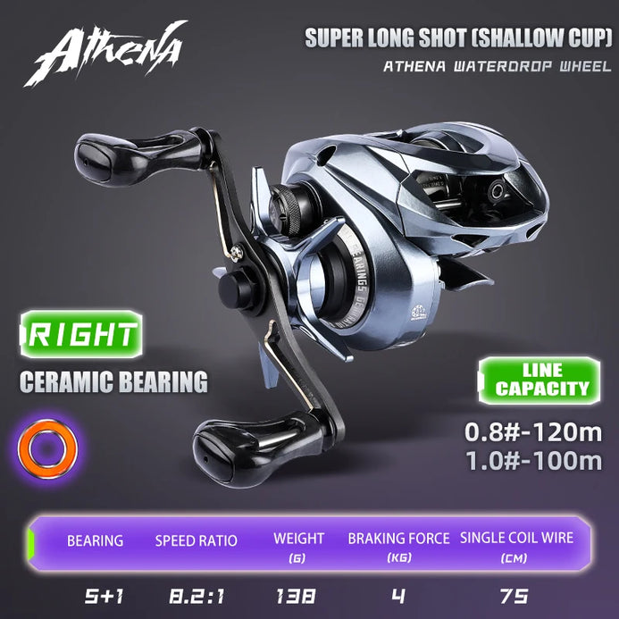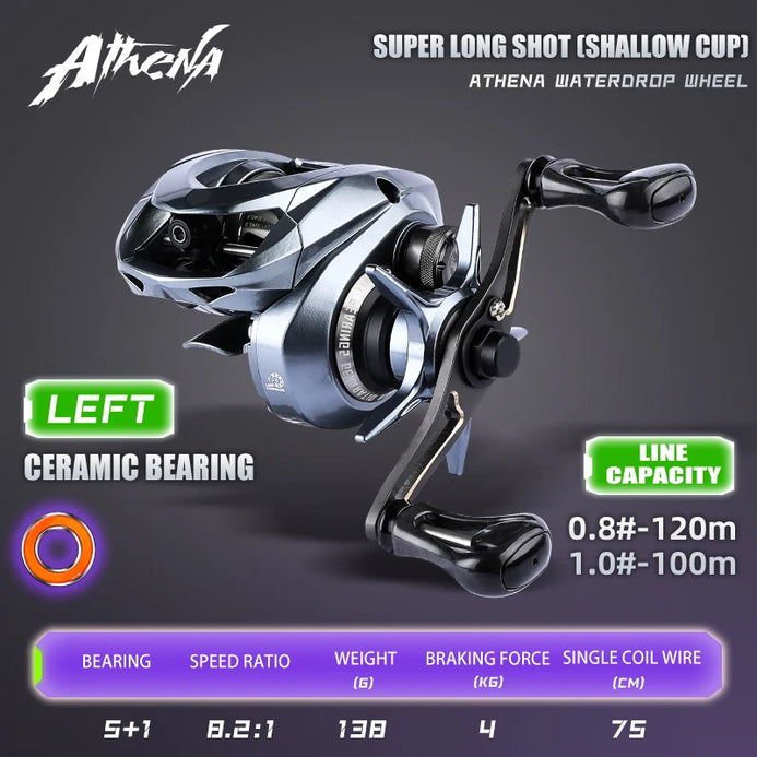 Experience the thrill of ultimate precision and control with the BearKing Athena Waterdrop BFS Baitcasting Reel. Weighing in at only 138g, its ultra light carbon construction allows for effortless casting. With a gear ratio of 8.2:1 and 5+1BB, this reel provides unmatched speed and smoothness. Dominate the waters and reel in the big catch with the BearKing Athena!