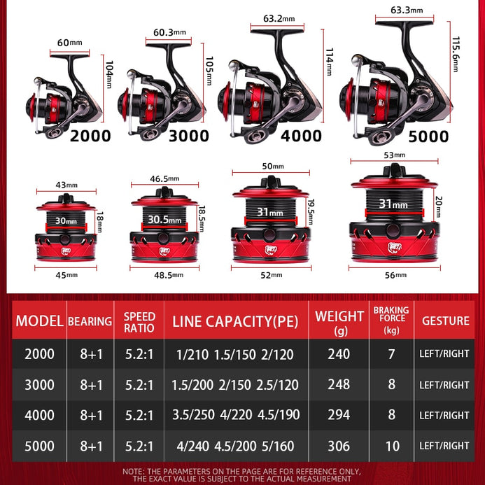 APOLO 5000| Gear Ratio: 5.2:1 | Weight: 306g | Bearings: 9BB | Max Drag: 10KG | Line Capacity(PE):4/240  4.5/200  5/160