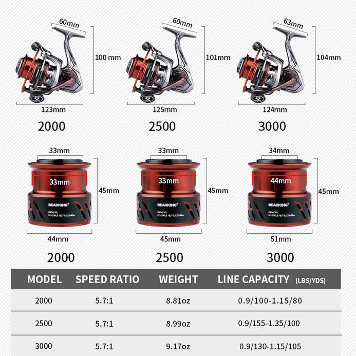 Zeus 2500 | Gear Ratio: 5.7:1 | Weight: 8.99oz | Bearings: 9BB | Max Drag: 7KG | Line Capacity(LBS/YDS): 0.9/155-1.35/100