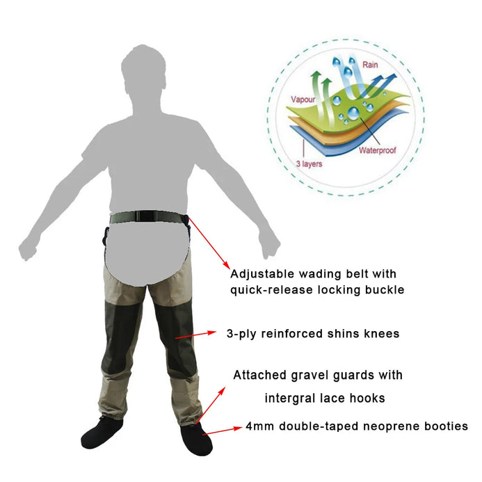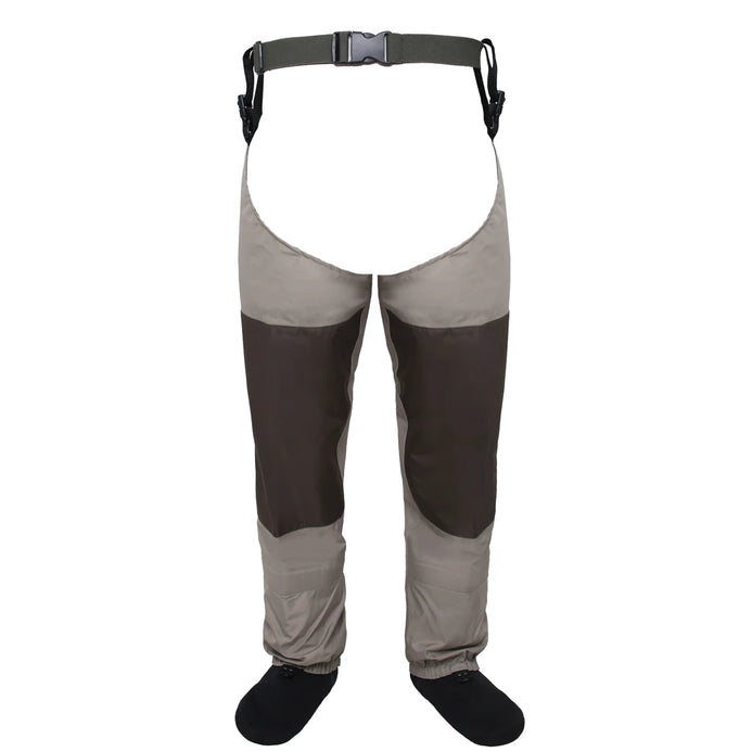 Designed for shallow wading, keeps you your lower legs dry from the foot to the knee . Made of  Three-ply waterproof and breathable fabric with a laminate upper, provides flexibility and durability for all day walking and wading comfort. Interior built in cinch strap just below the knee provides a secure fit and prevents water from entering the foot area while wading or hunting. 4-mm neoprene stocking foot bed; easily fits into your wading boots with built-in gravel guards. Versatile uses, great for hunting in marshes or tall grass, keeps feet and legs dry, great for john boats, kayaks, canoes and drift boats too!