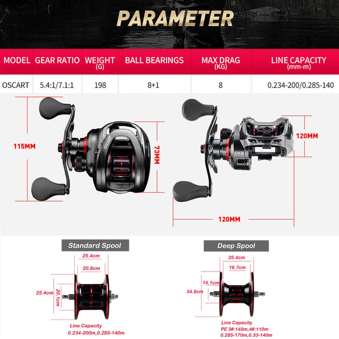 The JOHNCOO Oscart Baitcasting Reel 7.1:1/5.4:1 9BB is the reel of champions! Get ready to reel in the catch of the day with this top-tier baitcasting reel from JOHNCOO. With 9 ball bearings, you can be sure you'll have the competitive edge needed to bring home the big one!