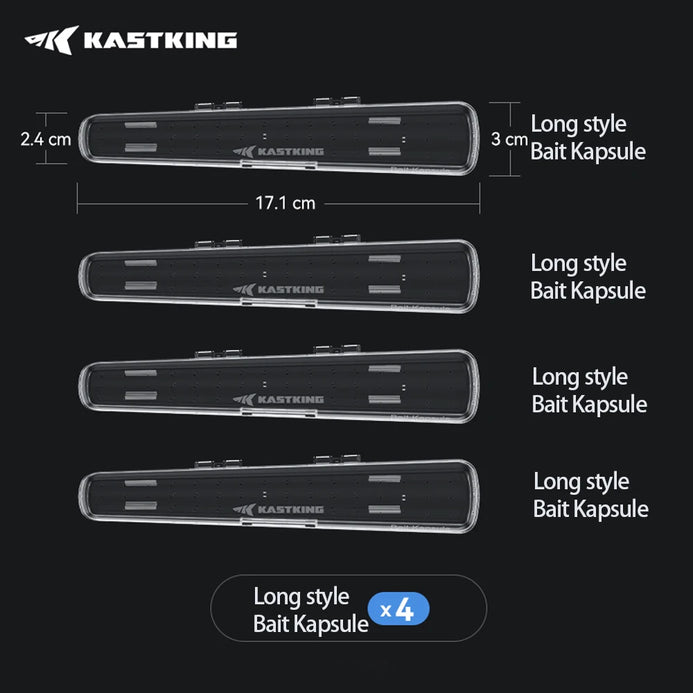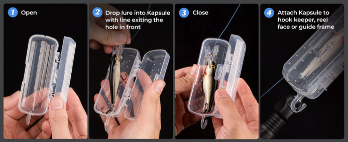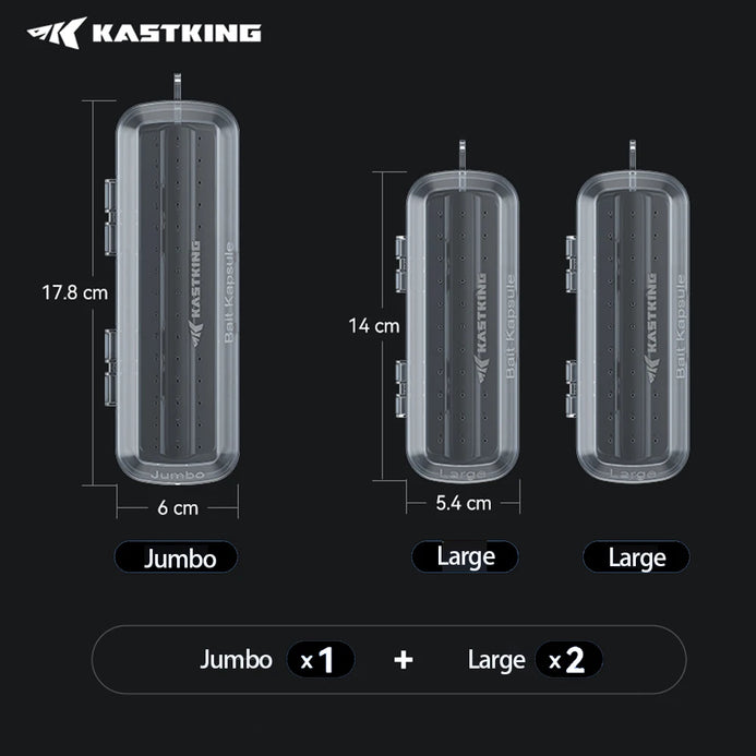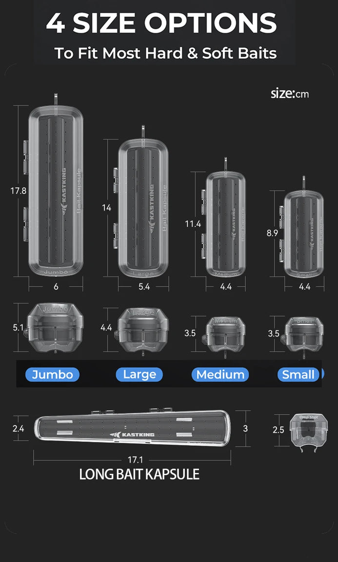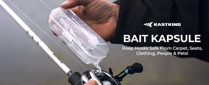 • Patent Pending Lure Protection & Storage: The innovative KastKing Bait Kapsule features a durable polypropylene molded shell that safeguards your baits and lures, ensuring they stay in prime condition while stopping hooks from getting caught on carpet, clothing, hands and even pets.Multiple Attachment Options: Equipped with a built-in hook, this bait cover offers multiple attachment options, including the hook keeper, reel face, or guide frame. Lures are easily removed from the Kapsule when you are ready to fish and quickly drop back into the Kapsule for storage.Corrosion Prevention: Vent holes are strategically placed to allow moisture to evaporate, preventing corrosion of bait hooks. Ideal for maintaining the longevity of your fishing equipment in all weather conditions.4 Size Options: (Available in Two sizes Large, Jumbo) to fit most hard & soft baits. Whether you're fishing in freshwater or saltwater, there's a Kapsule that fits your needs.Tangle-Free & Rod Protection: Say goodbye to tangles with other rigged combos and keeps hooks safe from boat carpet, seats, clothing, people and pets. The concave bottom and latch closure design ensure a secure fit and easy transport. No-Abrasion fishing Line entrance allows baits to remain tied to your line.