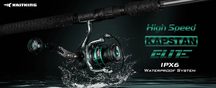 Kapstan Elite High Speed Spinning Reel is KastKing’s highest level 100% Waterproof fishing reel at IPX6 designation, with up to 15 EverSeal rubber rings to keep water out of the main gear. The amazing K.I.S.S. system includes labyrinth-style greased sealing grooves that reduce rotational resistance and provide an innovative water-tight seal. Designed with a powerful braking force for reeling in Big Fish with up to 55lbs max drag.