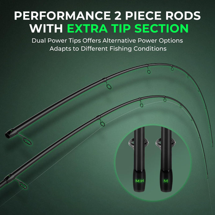 - INTERCHANGEABLE DUAL POWER TIPS: The Dual Power Tips design offer alternative power options to adapt to different fishing conditions. Each tip is clearly marked at the joint for easy identification. Both tips feature high-quality Fuji O-rings to ensure long casts and line protection..