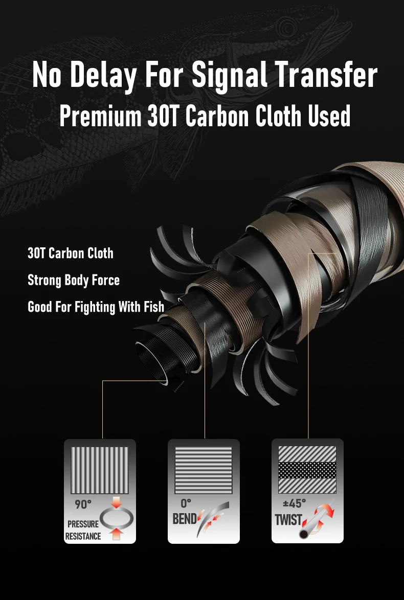 The Anatomy of Power: 30T Carbon & Multi-Angle Resilience. Premium 30T carbon fiber ensures instantaneous signal transfer with No Delay. The blank is engineered to withstand extreme multi-directional stress—resisting 90° Pressure, maintaining integrity at 0° Bend, and preventing ±45° Twist—for supreme control and a Strong Body Force perfect for fighting fish.
