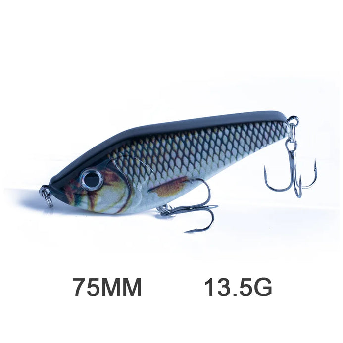 3) Overall Structure: The Internal Structure Uses The Steel Ball To Balance The Conduction. When You Take The Line, The Ball In The Body Is Transmitted To Other Parts And Produces Sound, Which Can Drive The Fish To Chase. The Shape Is Made Of Carbon Steel With 2 Super Sharp Treble Hooks To Ensure That The Fish Will Not Escape. Those Jerkbaits Are Ideal For Capturing Sea And Freshwater Species.