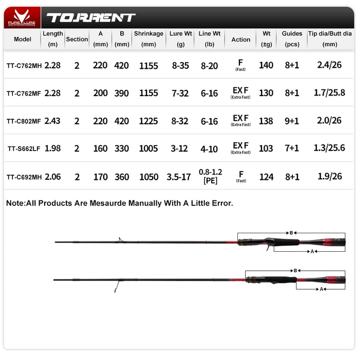 The PureLure Red TORRENT is a versatile two-piece casting and spinning rod engineered for serious anglers. Available in five lengths (1.98m to 2.43m) and three power ratings (Light, Medium, Heavy), it adapts to everything from finesse presentations to power fishing. The modular 2PC design breaks down for easy transport and storage without sacrificing sensitivity or strength. Premium construction delivers responsive feedback and reliable performance across freshwater and light saltwater applications. Whether you're targeting panfish or larger species, the TORRENT's balanced action and durable build make it a dependable choice for weekend warriors and dedicated anglers alike.