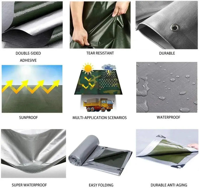 MATERIAL - Our PE tarps super waterproof, sunscreen, anti-corrosion, easy to fold, environmentally friendly, non-toxic, anti-aging, no peeling, no fading, lightweight, wear-resistant, cold-resistant, soft and durable.