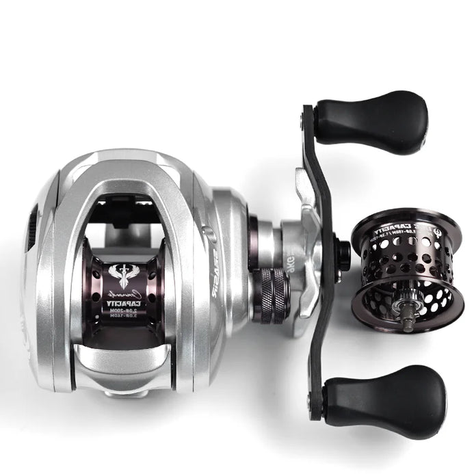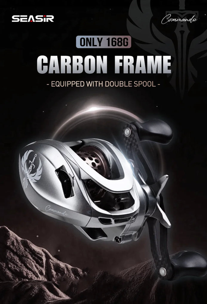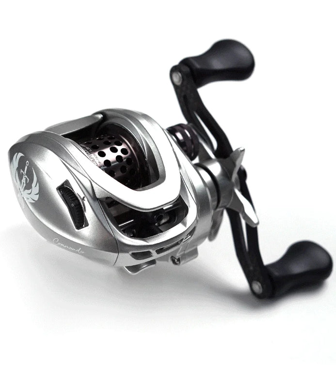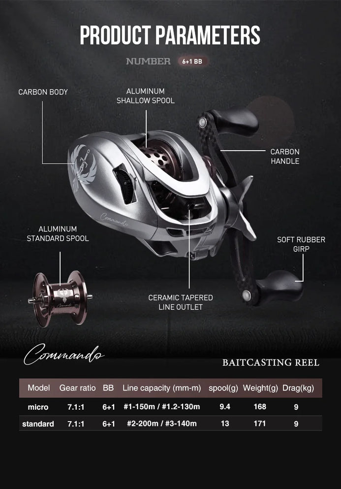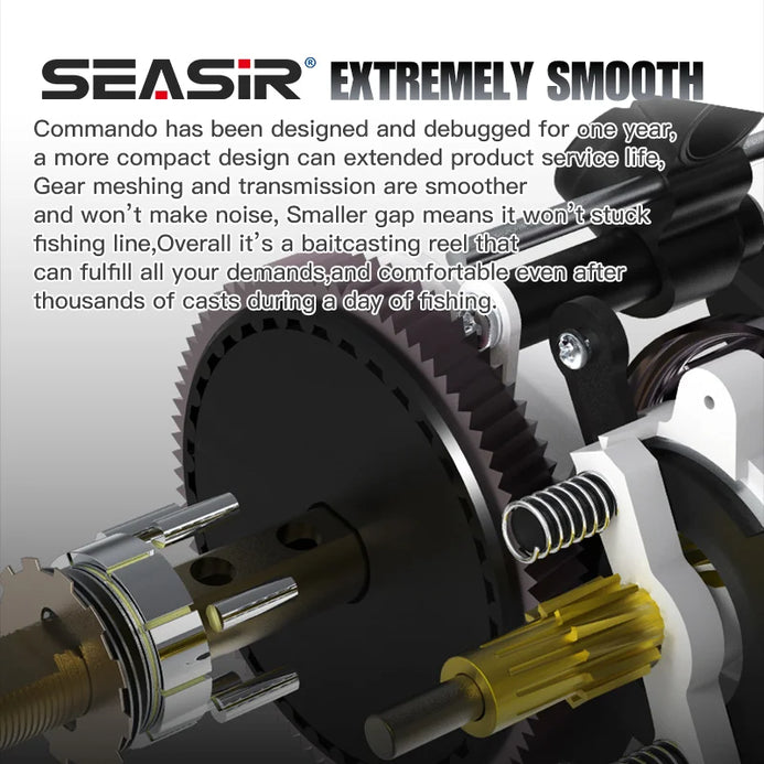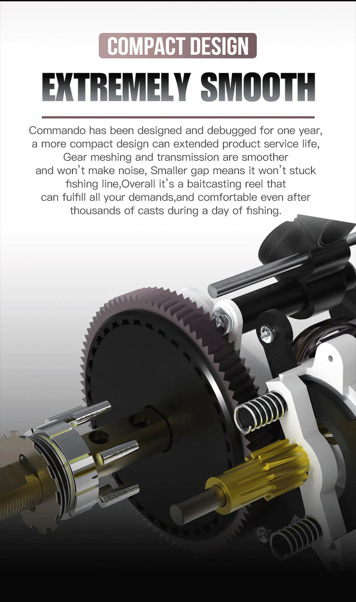 Commando has been designed and debugged for one year, a more compact design canextended product servicelife,Gear meshing and transmission are smoother and won't make noise, Smallergap means it won't stuck fishing line,Overall it's a Baitcasting reel that can fulfill all your demands,andcomfortable even after thousands of casts during a day of fishing.