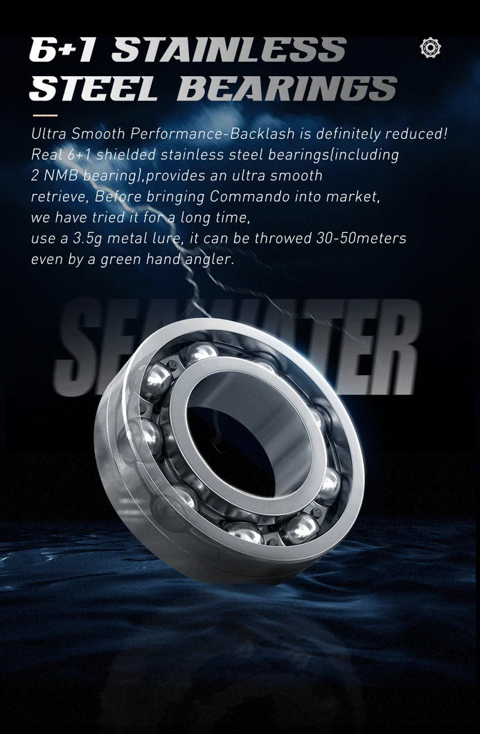 Real 6+1 shielded stainless steel bearings(including 2 NMB bearing),provides an ultra smooth retrieve, Before bringing Commando into market, we havetried it for a long time, use a 3.5g metal lure, it can be throwed 30-50meters even by a green hand angler.