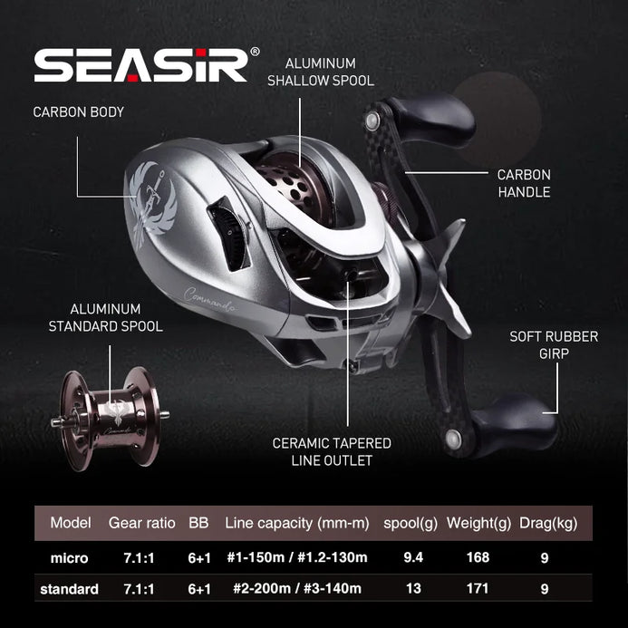 Seasir Commando Carbon BFS Ultralight Baitcasting Reel 7.1:1 6+1BB 9Kg Max Drag