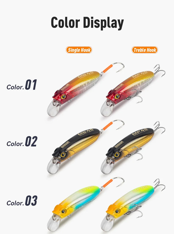 1.4.7G/6G/6.2G/9.8G/12.2G – A versatile lure for all water depths! Whether slow-sinking, fast-sinking, or floating, this lure is effective in any fishing scenario!