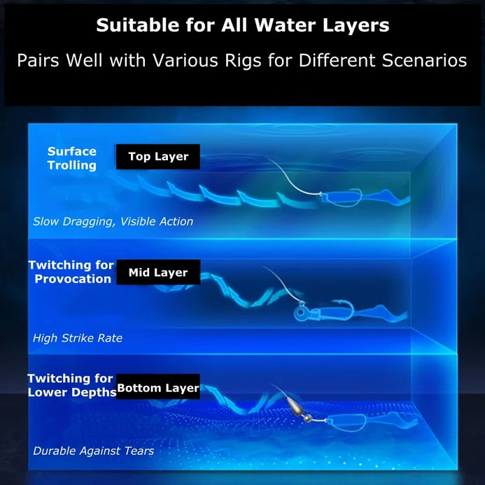 •Soft and Durable PVC: Attracts fish while resisting tears.