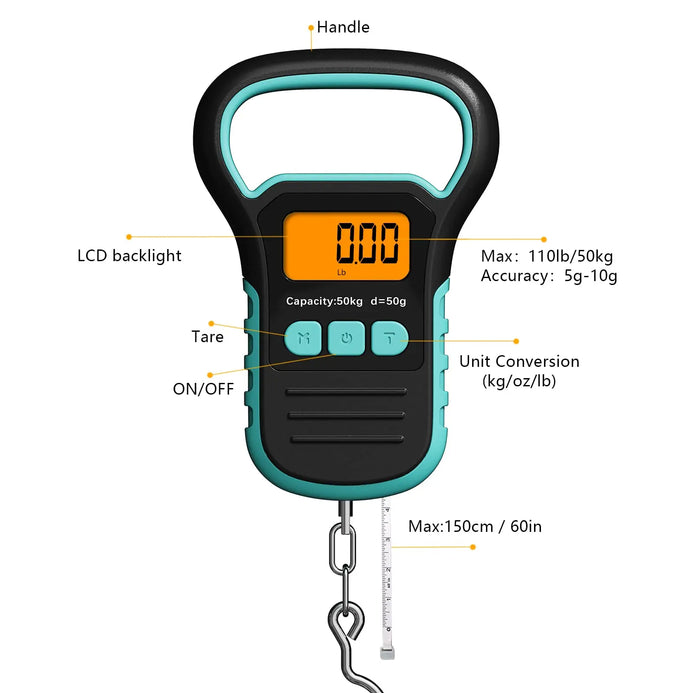 【Tape Measure Design & Fish Control Device 】Not only can this be used as a fishing scale, it comes with a 38-inch retractable tape measure, you can use it to check the size of luggage, measure the packaging of express parcels, and it can also be used for daily shopping and weighing. The floating non-puncture design fish control device will not harm the fish, it can be firmly fixed in place for weight measurement, this fish control device will not sink when dropped into the water.