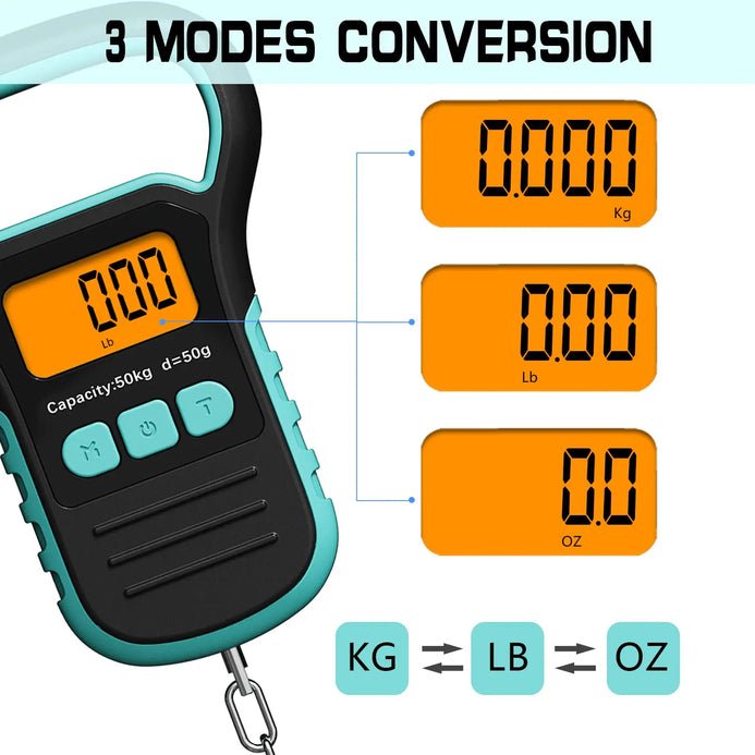 【Wide Measuring Range & High Precision】The digital fishing scale has a measuring range of 15g-50Kg, built-in high-precision sensor system, high sensitivity, accurate weighing, and a response time of about 2s. It also has three measurement units of Kg/LB/OZ, which will bring you greater convenience.