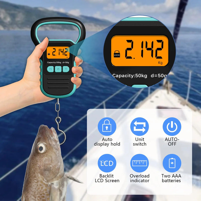 【LCD Backlight & Multi-function Display】The fishing postal hanging hook scale adopts LCD orange backlit display with clear readings, making it easy to read the data even in the dark. The IPX4 waterproof fishing scale also supports low battery display and overload indication, which is convenient for you to replace the battery in time and use it correctly, and prolong the service life of the product (included 2 x AAA batteries and 1 x screwdriver).