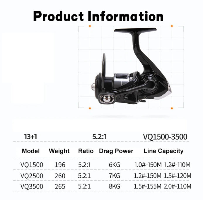 Mavllos VQ Trout Spinning Reel 5.2:1 Ratio 13+1BB Max Drag 6-8Kg