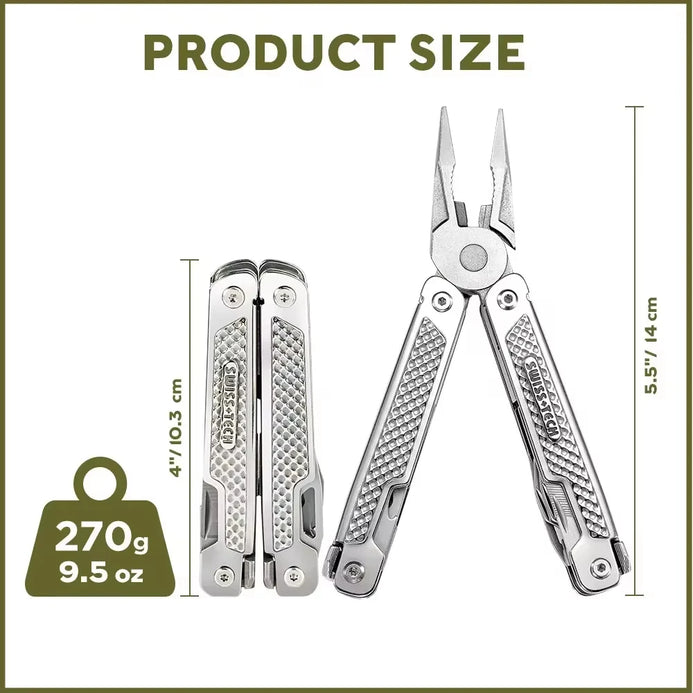 Wire stripper, Bolt gripper, Wood/metal file. Knife, Large slotted screwdriver, awl, bottle opener, flat, long nose pliers, wire cutter, scissors, key chain, can opener, phillips screwdriver