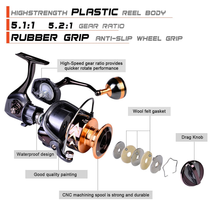 The ProBeros DW Series Spinning Reel boasts an ultra powerful 11-21kg max drag, allowing for smooth and efficient retrieval of fish. With a gear ratio of 5.2:1, this reel is designed for optimal performance and control. Perfect for avid anglers seeking a high-quality and reliable spinning reel.