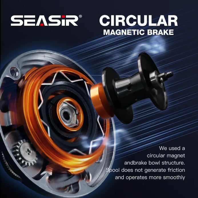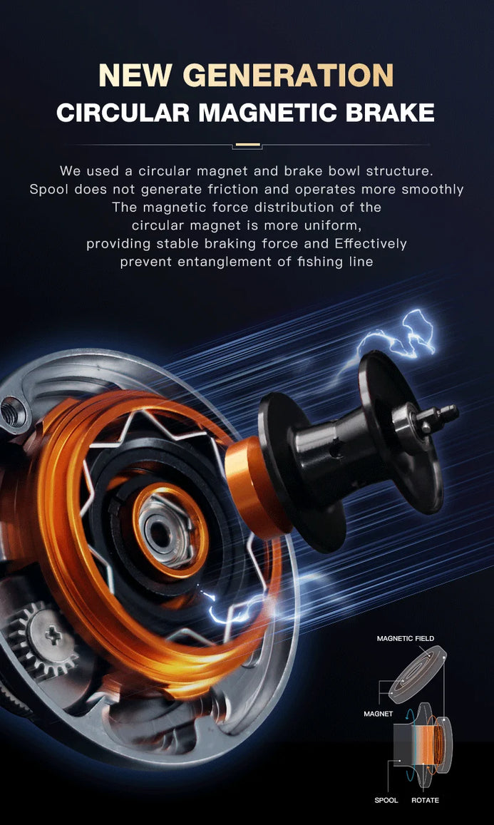 We used a circular magnet and brake bowl structure.Spool does not generate friction and operates more smoothly.The magnetic force distribution of the circular magnet is more uniform,providing stable braking force and Effectively prevent entanglement of fishing line.
