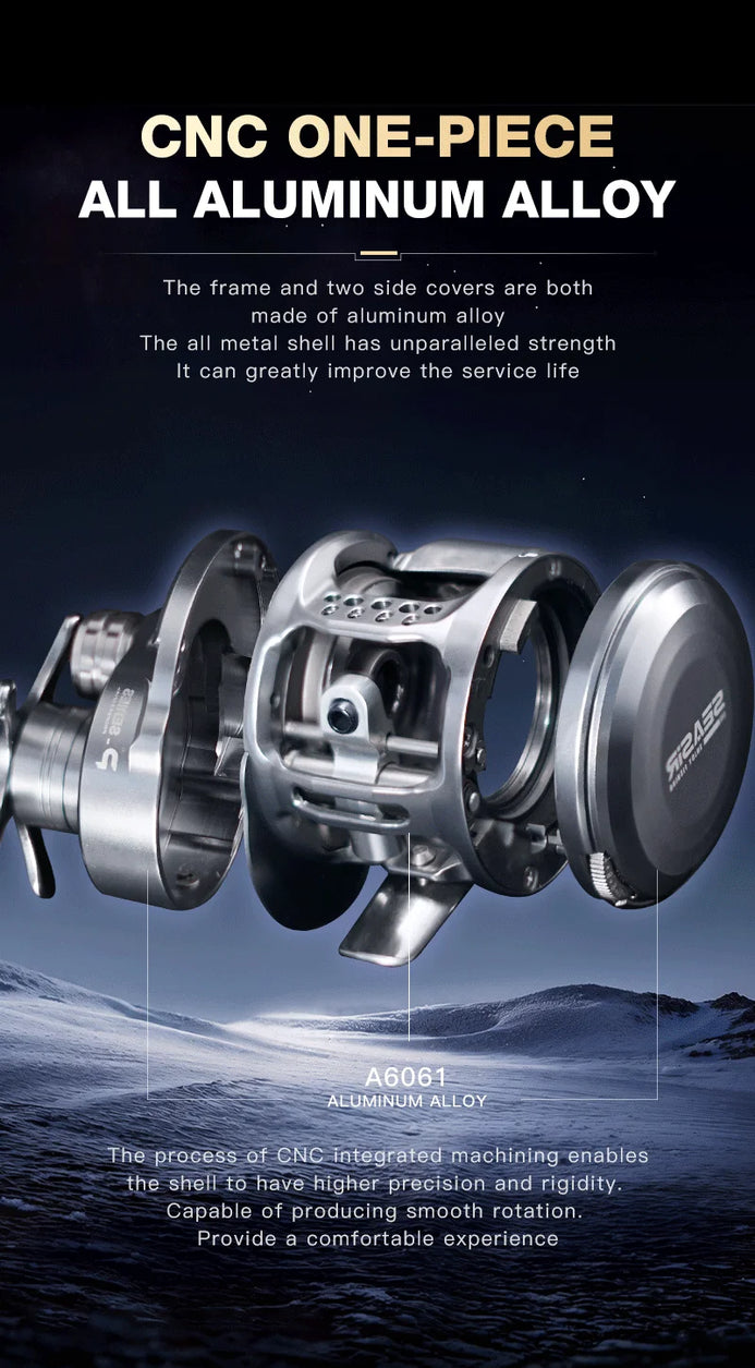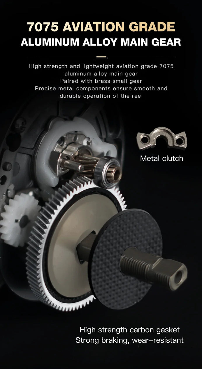 High strength and lightweight aviation grade 7075 aluminum alloy main gear.Paired with brass small gear.Precise metal components ensure smooth and durable operation of the reel.