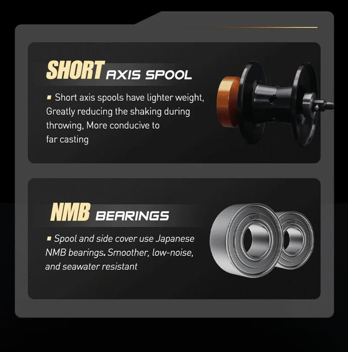 Spool and side cover use Japanese NMB bearings. Smoother, low-noise,and seawater resistant.