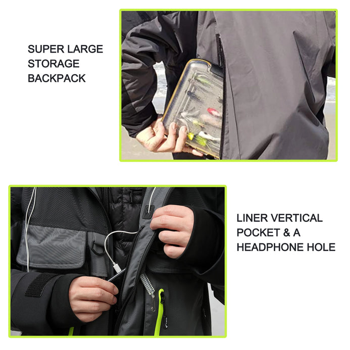 • User Friendly Design: 8 Fans Waterproof Fishing Jackets for Men Women added a pocket on the left sleeve to store fish hooks, GPS and any small items. The Liner adds a headphone hole for freeing hands to make and receive calls while Fishing, Hiking etc. The Sleeves also have adjustable velcro to meet your needs when your fishing.