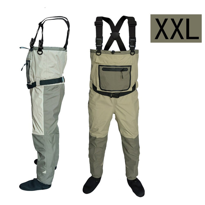 Comfortable stocking boot Breathable waders with adjustable elastic force suspenders, handwarmer pocket and attached gravel guards.