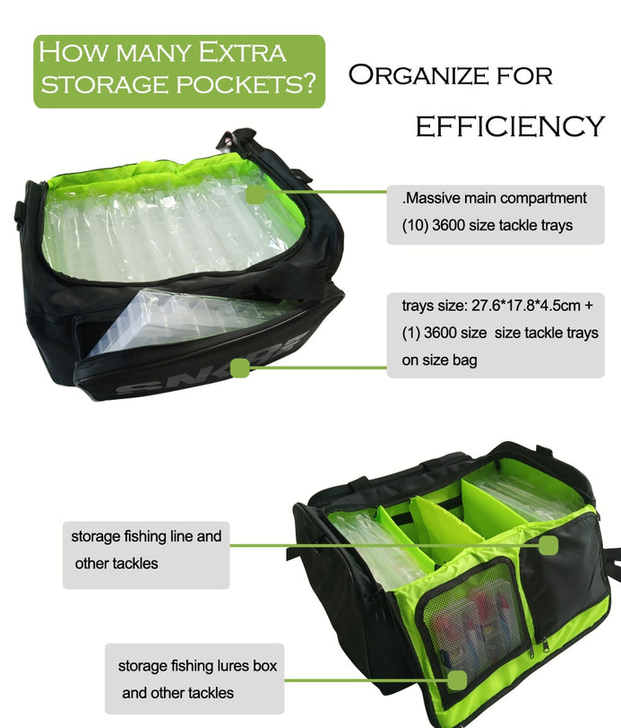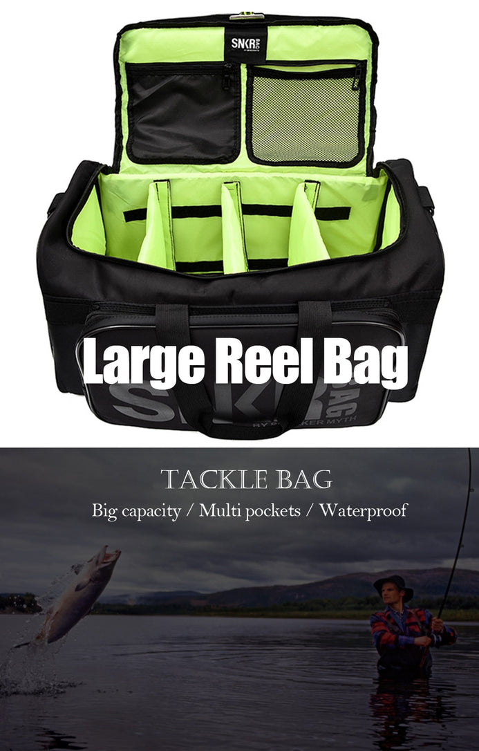 Sport fishing bag is made from high quality Nylon waterproof material, holdall bag dimensions: 50x26x28cm which is enough for storage fishing reel.