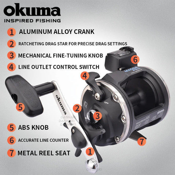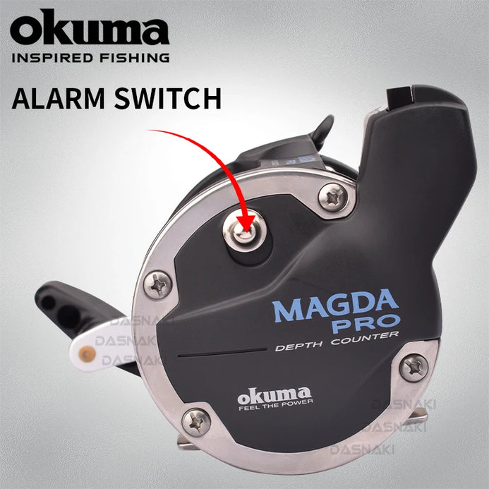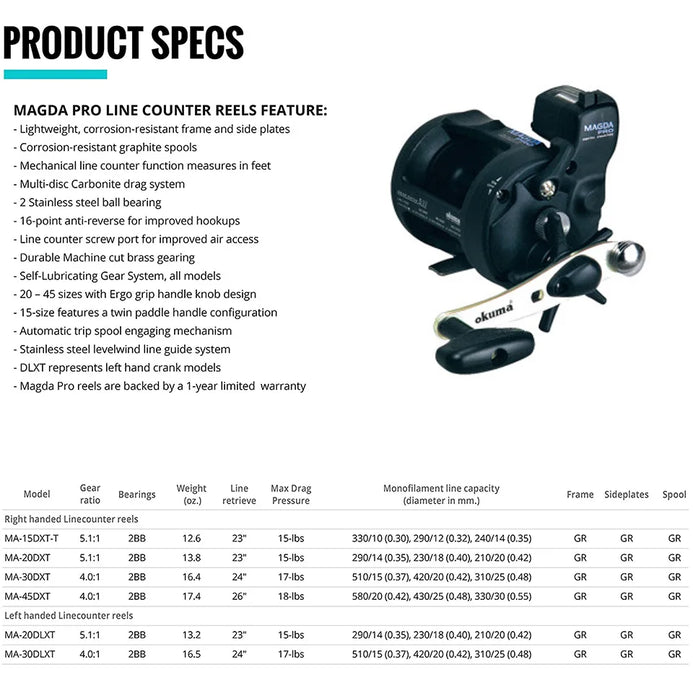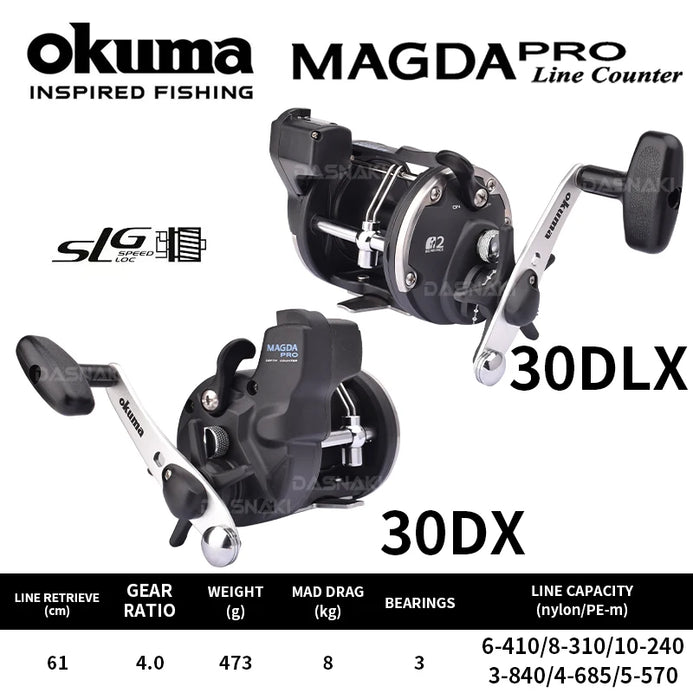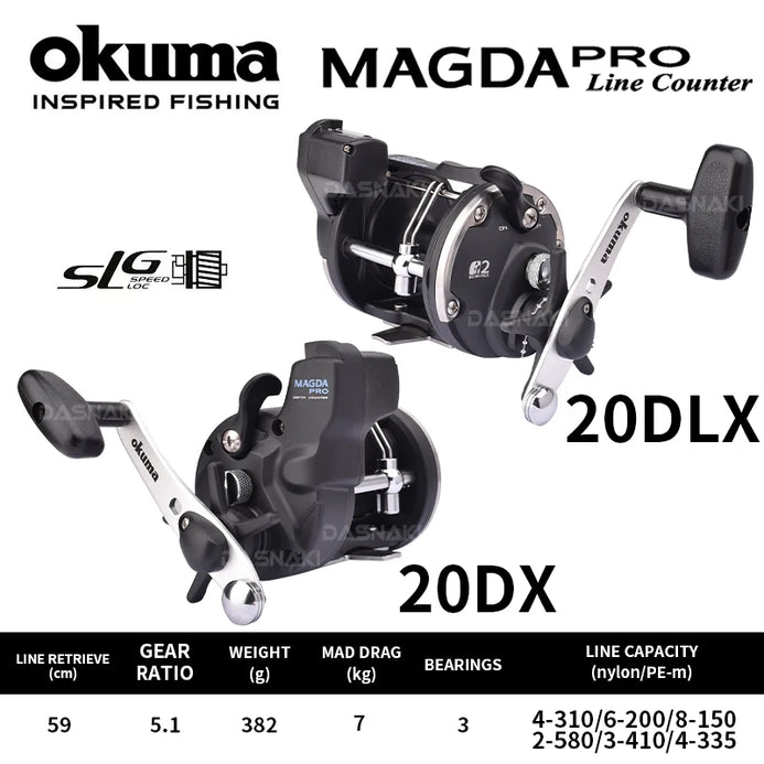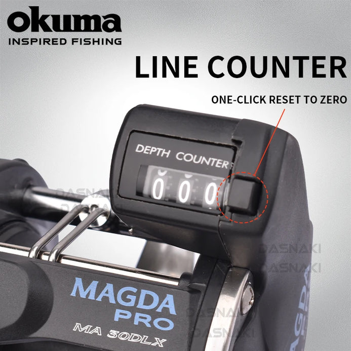 The Okuma MAGDA Linecounter DT is a mechanical line-counter baitcasting reel built for trolling, light offshore, and general baitcasting applications where precise depth control is useful. Designed with corrosion-resistant materials and a robust mechanical counter, this reel lets anglers accurately measure how much line is out, making it ideal for trolling, lead-core setups, deep casting, or anchoring deep baits.