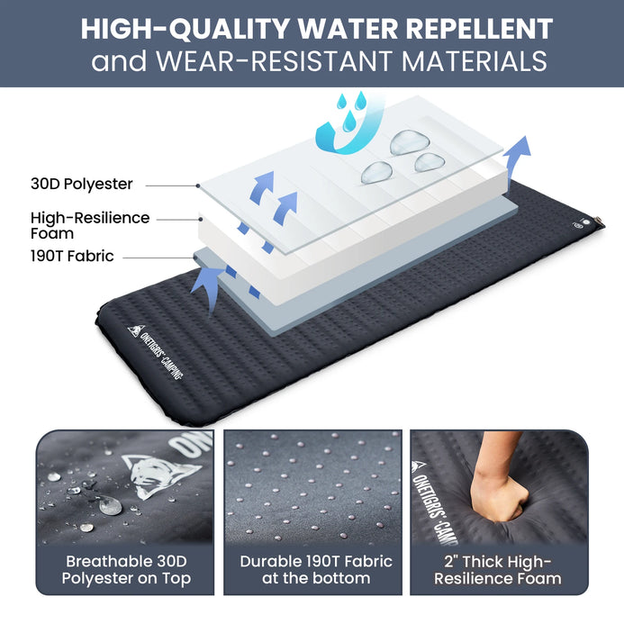 WEAR & TEAR RESISTANT: 30D outer shall with TPU coating that is “waterproof breathable”, soft to the touch, durable, low-noise, paired with 190T bottom fabric that is highly durable, with anti-slip grip dots to offer better sleepy quality.