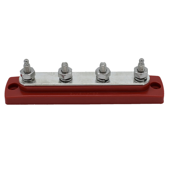 This 4-gang common stud busbar simplifies grounding or positive distribution across multiple circuits. With a single input stud and four output studs, it’s a versatile choice for compact wiring systems.
