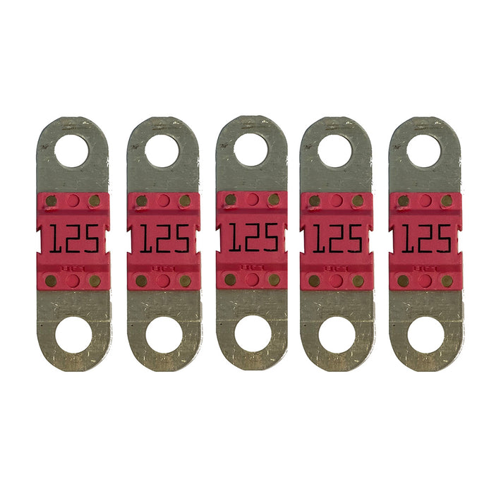 Victron Energy's MIDI fuses are essentially a smaller version of the MEGA fuses and are known to have low voltage drop and cold resistance. This particular pack of Victron MIDI fuses contains five 125-amp fuses.