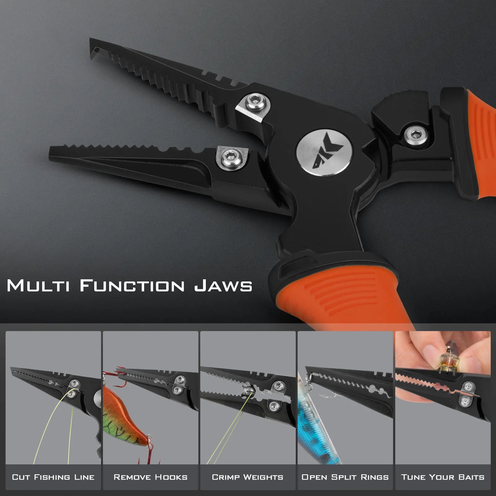 • Precision and Control: Benefit from the angle-nosed pliers with features like bait tuning slots and carbide line cutters that handle braided, mono, and fluorocarbon lines effortlessly. The pistol grip with reinforced jaws ensures a secure grip on the fish