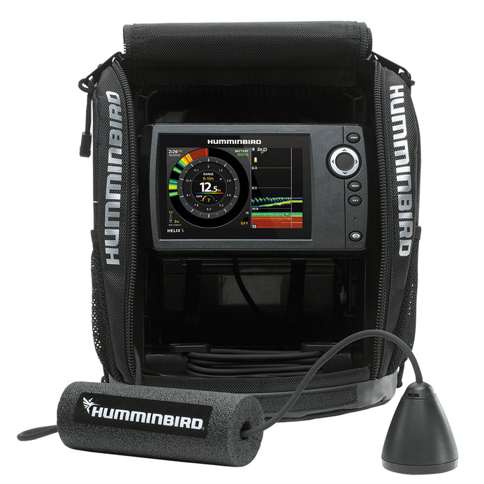 • What’s Included: ICE HELIX 5 CHIRP G3 fishfinder, Dual Spectrum CHIRP ICE transducer, 9Ah battery and charger, ICE shuttle, hardware, power cable, and portable bag.