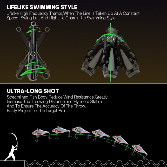 2) Rattling steel ball inside lures to keep balance ,offer lifelike swimming action in water.Noise model design,make VIB more easily to be sensed.