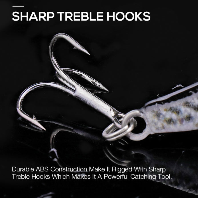 5) Durable ABS construction make it rigged with sharp treble hooks which makes it a powerful catching tool.