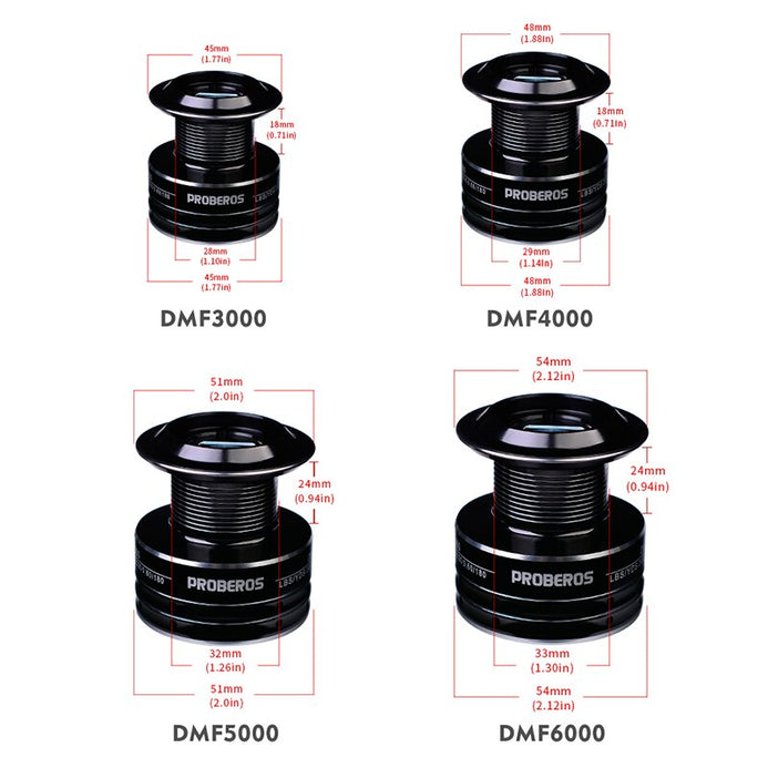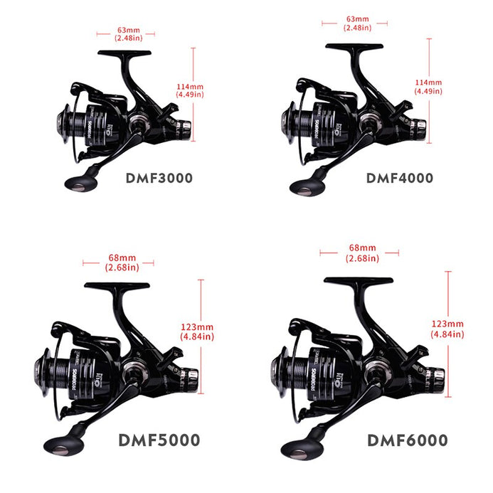 Line Capacity DMF3000:0.30mm/200m, 0.35m/160m, 0.40mm/120m Line Capacity DMF4000:0.40mm/155m, 0.45mm/125m, 0.50mm/100m Line Capacity DMF5000:0.45mm/180m, 0.5mm/145m, 0.60mm/100m Line Capacity DMF6000:0.40mm/280m, 0.50mm/230m, 0.60mm/180m Drag Power Range:3000(13kg)/4000(15kg)/5000(17kg)/6000(19kg) Weight Range:3000(342g)/4000(351g)/5000(453g)/6000(470g) Gear Ratio(3000-4000Series):5.2:1
