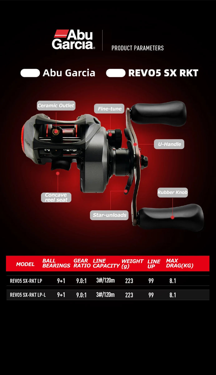Abu Garcis Revo5 SX Rocket Baitcasting Reel (2023 Model) 9.0:1 Ratio 9+1BB 8.1Kg Max Drag