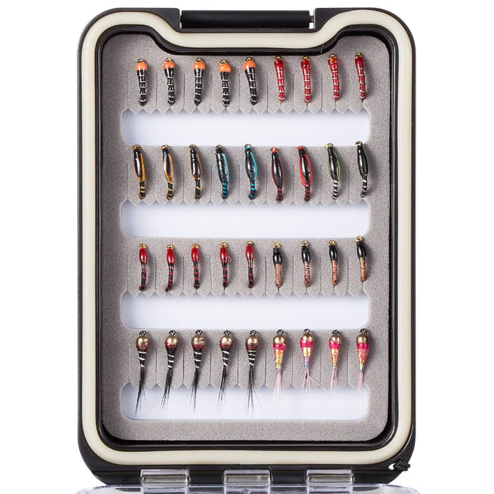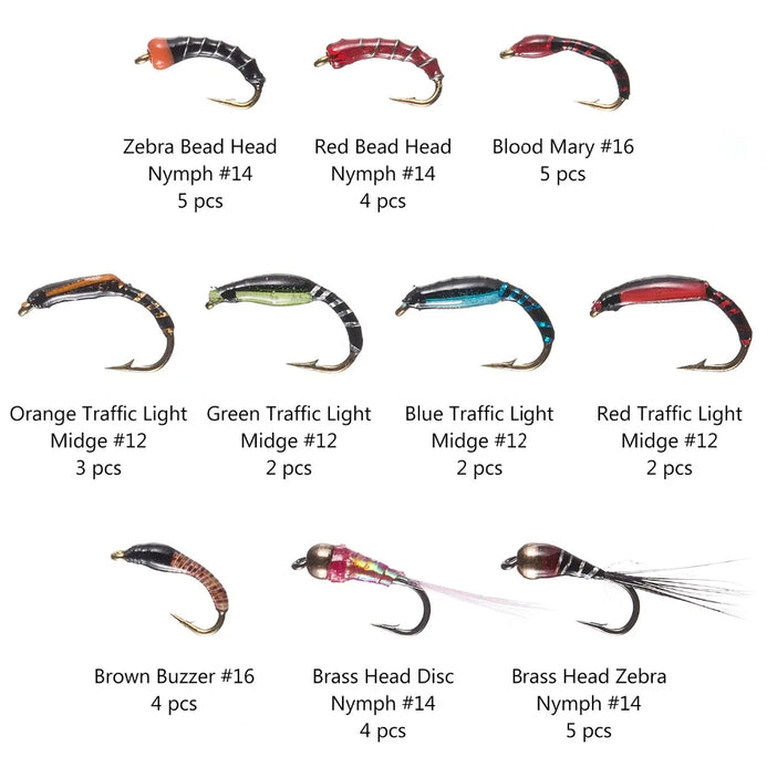 The 36 pcs nymphs in this collection are all coated with clear epoxy for maximum longevity and to insure weight and give the flies a brilliant sheen, adding an extra touch of realism