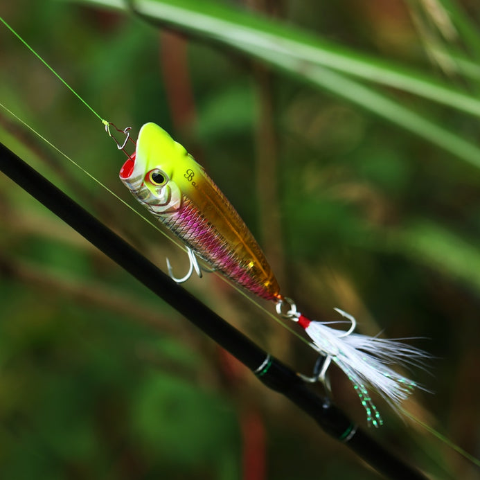 Long nose and big cup grasp much water and makes pop sound when it touches the water. That sound appeals to big bass that hiding far back in the cover.