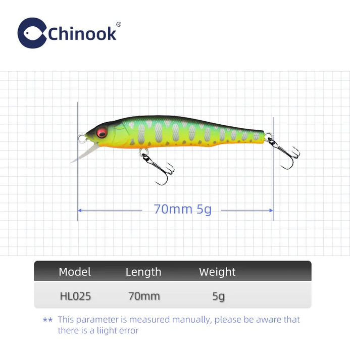 Take on the ultimate fishing challenge with the Chinook Sinking Lipped Minnow! This 70mm, 5g lure is designed for risk-takers who are ready to conquer the depths. With its unique lipped design, this lure sinks and moves through the water with bold, irresistible action. Are you ready for the thrill?