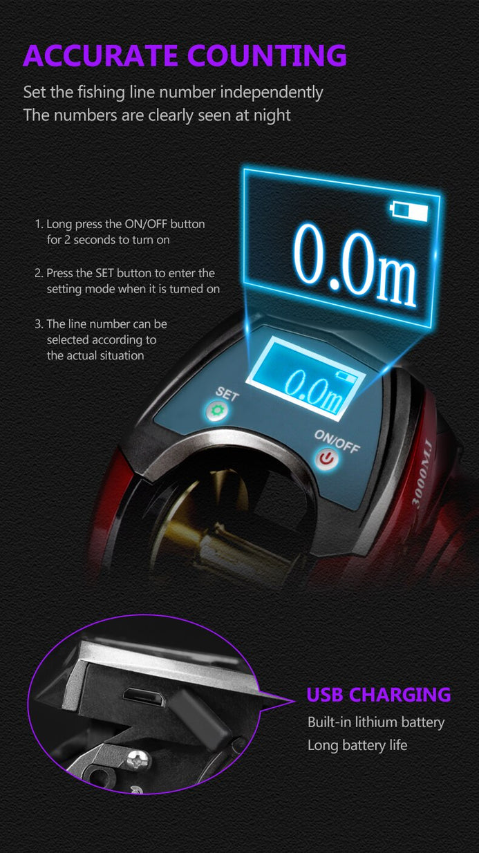 Features: carbon fiber body, cold light digital display, built-in lithium battery for precise line counting, durable endurance and a strong magnetic brake system.